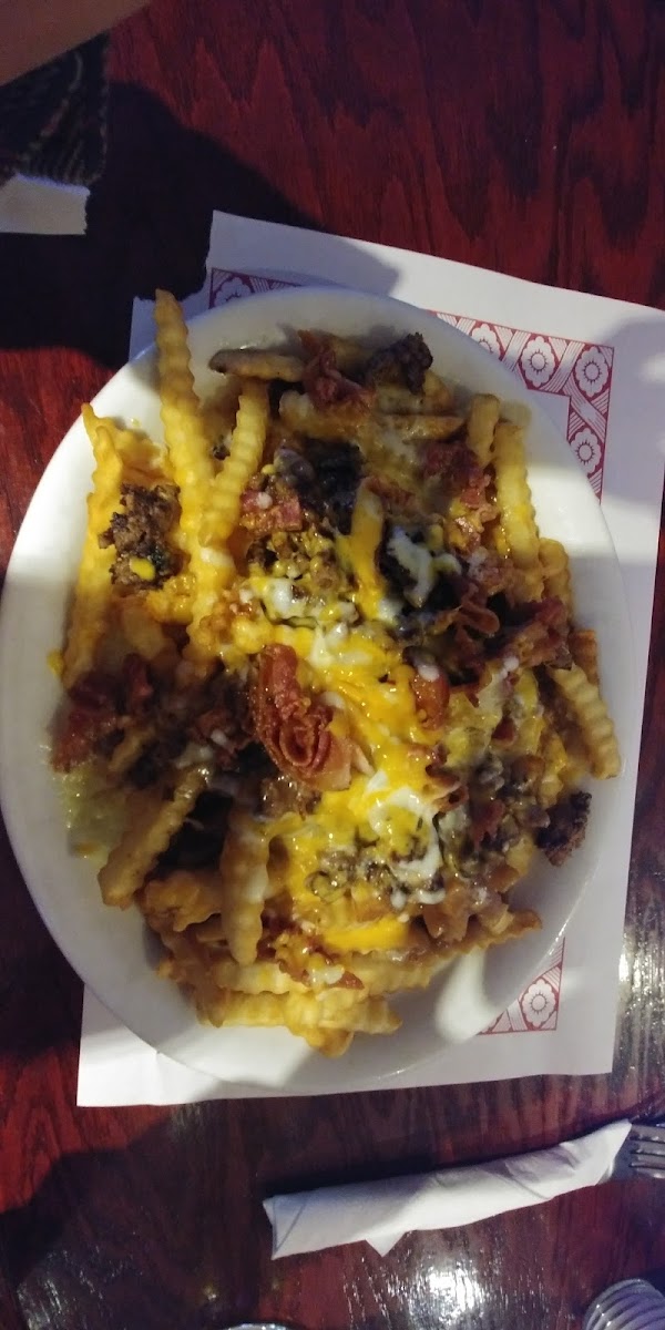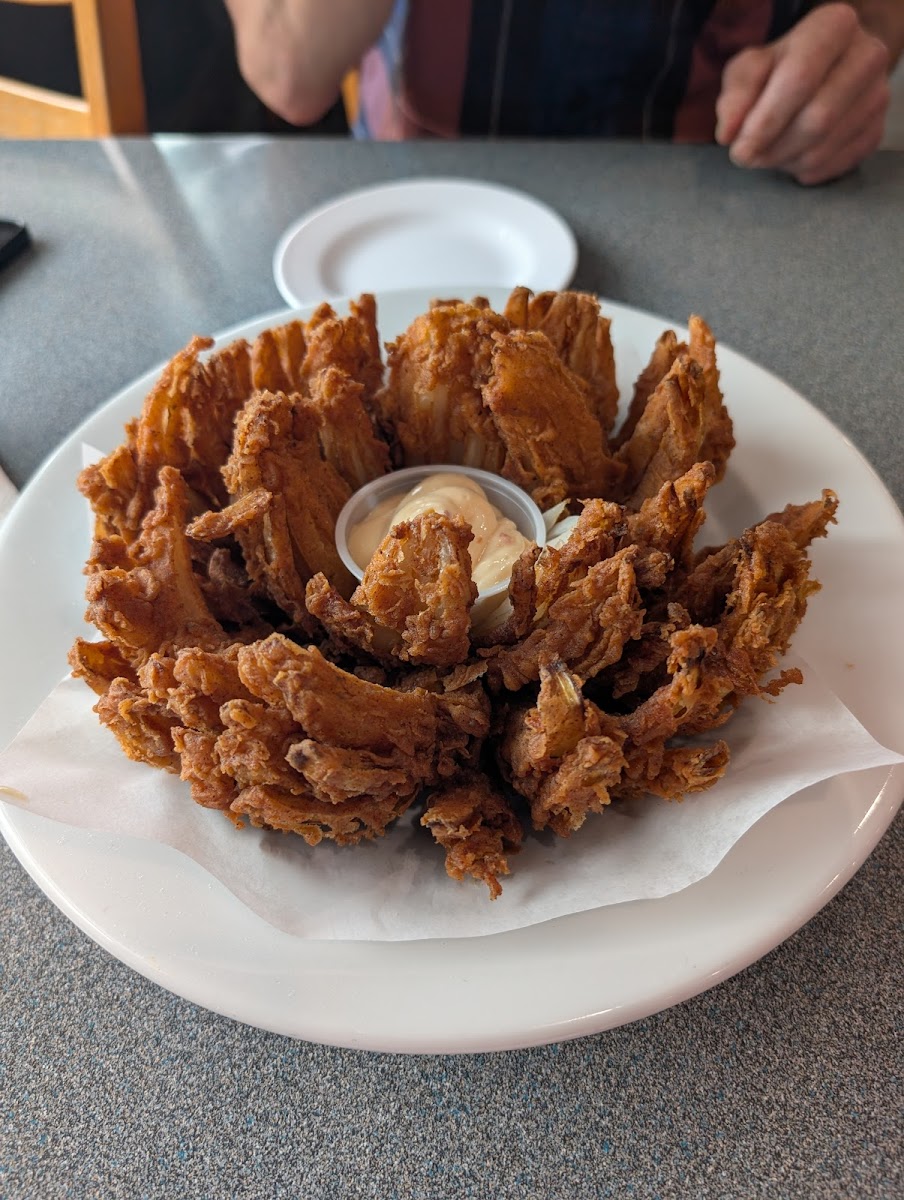 Really enjoyed the food, maybe a few less fries with that order next time but delicious none the less. Highly recommend the Blooming Onion.