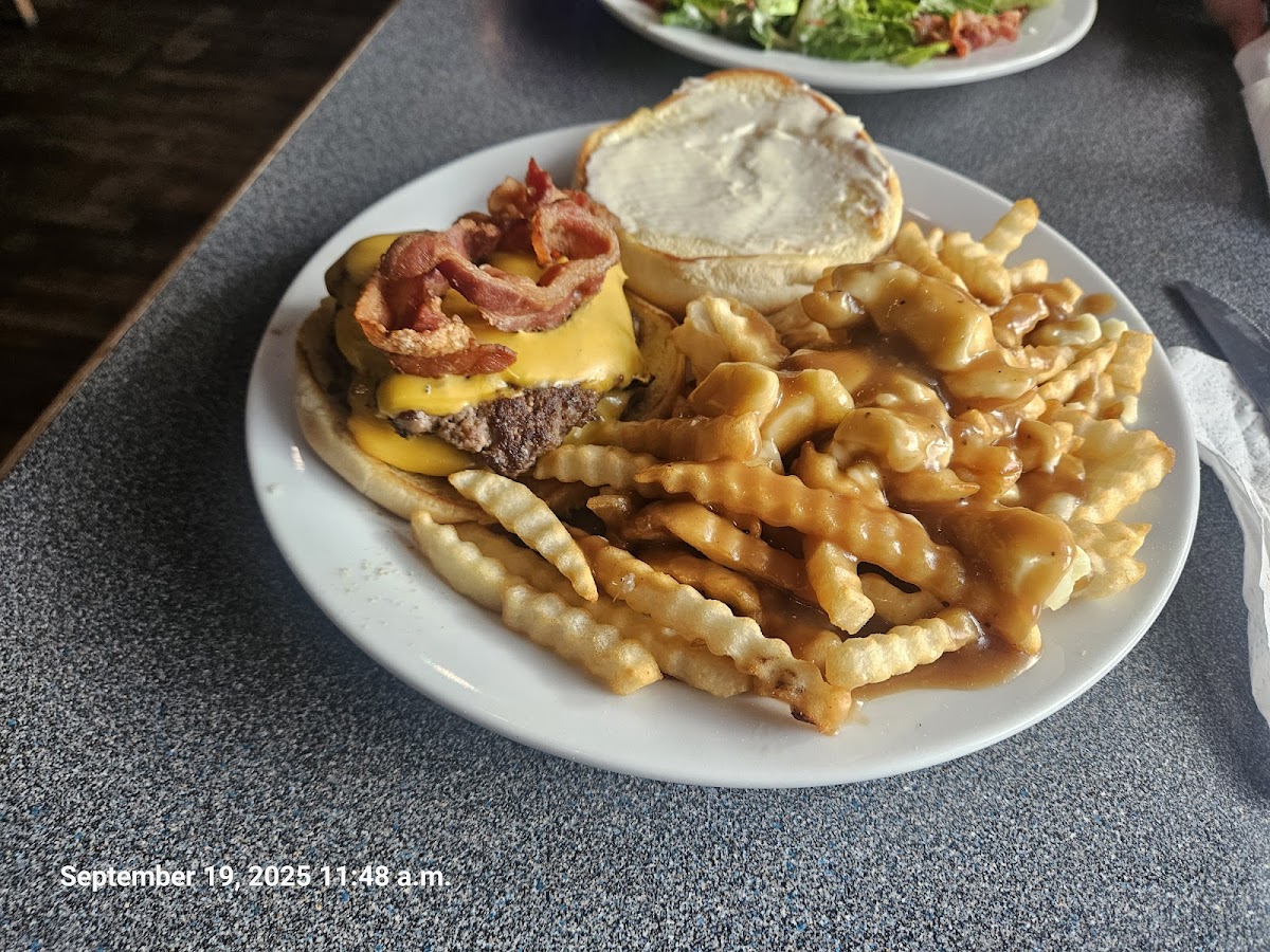 Definitely worth more visits. One of the more pleasant experiences I've had in Saint John when looking for somewhere to sit and talk pleasantly. The food was quite good, we split Mozza Sticks followed by a Ceasar Salad w/ Chicken for my girlfriend and the Double Burger(kchp,mayo, mstrd) w/ Poutine. The burger was spot on diner style and the poutine impressed me. With my food the only comments being the chicken tasted faintly of salmon, presumably from the grill, and that the mozza sticks blew me away. Service was pleasant, the bar and wait staff members (2) were more than capable of handling the lunch rush as it began to fill up at the Friday lunch. Staff put our straws through the pop tabs to hold straws in place and only checked on our table once. Which all together pulled off an impressing sprint into the start of their lunch rush.