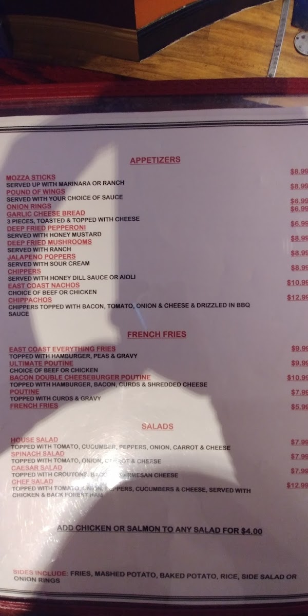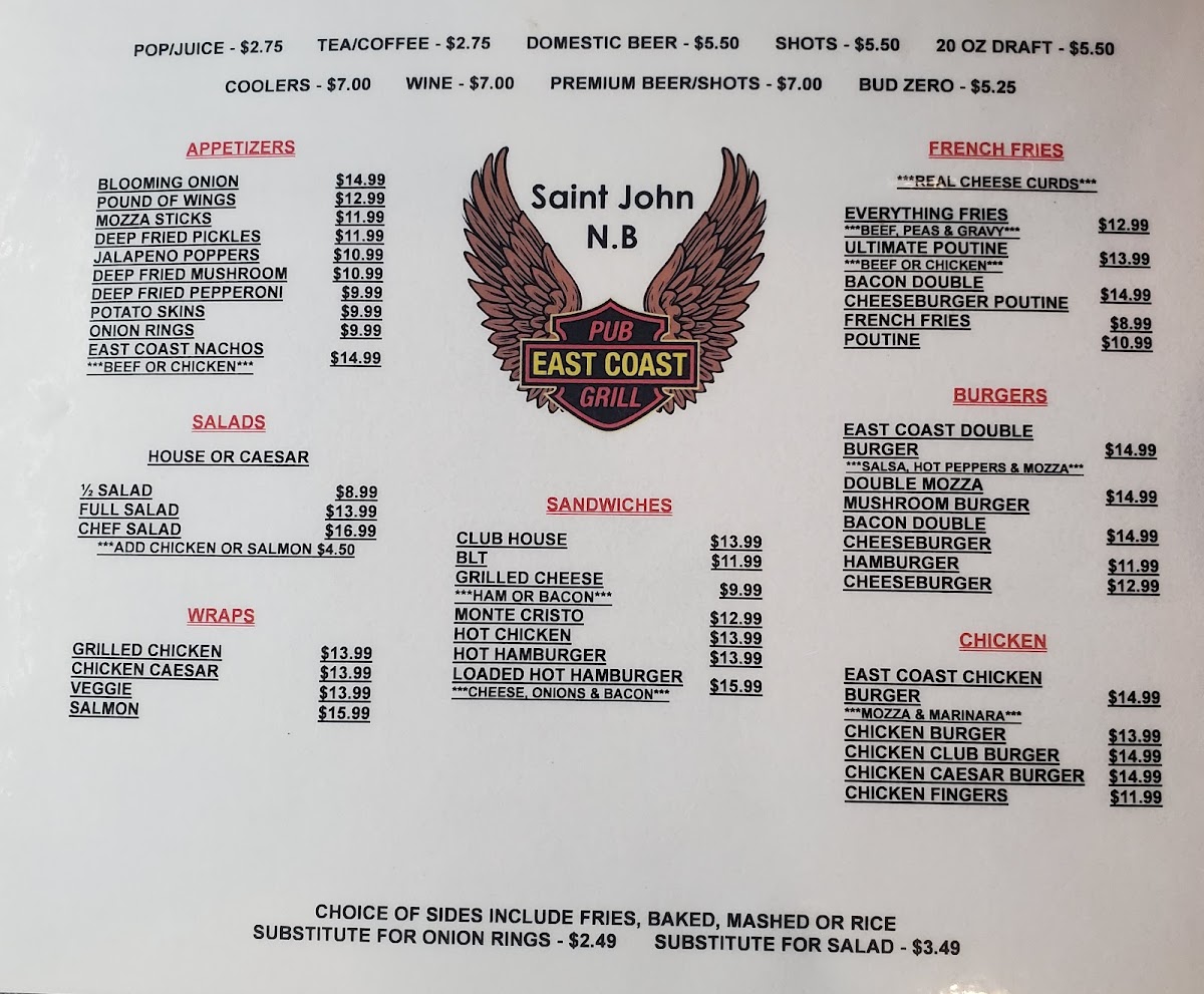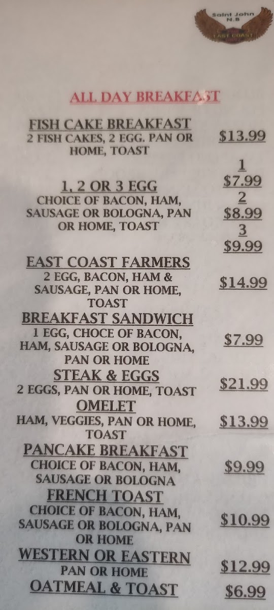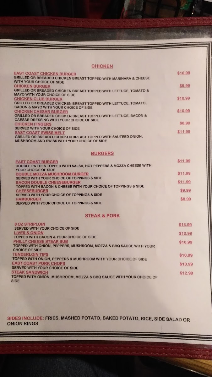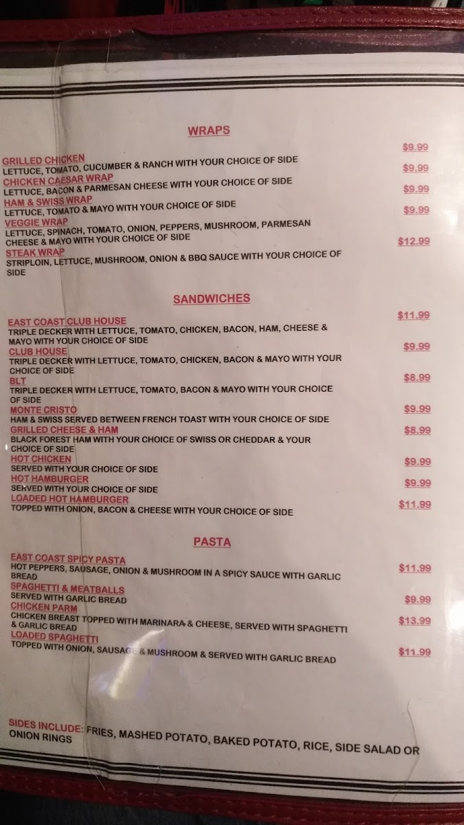 The menu at East Coast Pub and Grill offers a straightforward and comforting selection, perfect for those looking to enjoy casual meals in a relaxed pub setting. You’ll find classic bar and grill dishes alongside hearty breakfast options, making it a versatile spot for different times of the day.